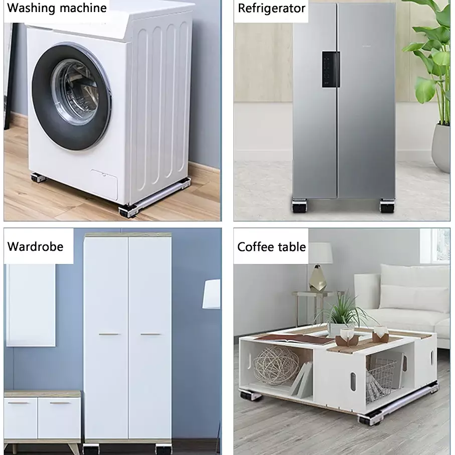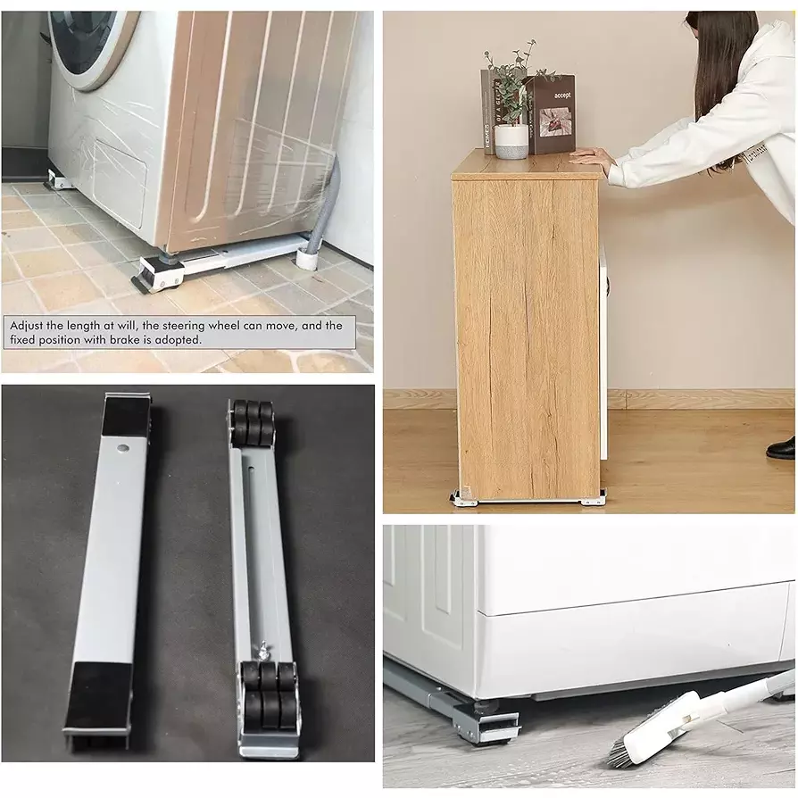 استخدامات متعددة: تتيح نقل الأجهزة الثقيلة بسهولة وتنظيف أسفلها دون الحاجة إلى التركيب، كما تساعد على رفع الجهاز عن الأرض. مناسبة للغسالات، الثلاجات، الثلاجات الصغيرة، المجففات المحمولة والمجمّدات